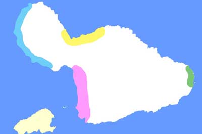 *マウイ島の気候 マウイ島は常夏というより、暑すぎず寒くもない過ごしやすい場所で、一年中ベスト・シーズンです。 4月中旬から10月の中旬までの乾季は、島中が晴れていて風が強いので、大気に透明感があります。お子様連れのウィンドサーファーが夏休みを利用してよく来られます。 10月下旬から4月上旬までが雨季になります。島は緑に包まれホエールウォッチングができます。ホエールウォッチングのベストシーズンは1月下旬から3月一杯でしょう。12月くらいから大波がやって来ますのでサーファーには最高の時期です。 エリア情報 |
