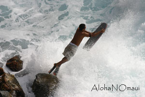 マウイの波は一部を除いてそれほど強くないのです。最も強い波は冬場のペアヒ(ジョーズ)、ホオキパ、ホノルアが有名ですがそれ以外の場所は上の写真のようにショート・ボードでひねりを加えるような乗り方ではなく、ロング・ボードでおおらかに乗る方が一般的です。